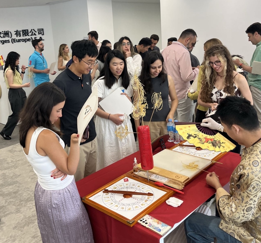 此次活动不仅准备了丰富的节日美食,包括香甜可口的中式糕点与传统粽子,还特别设置了两项沉浸式中华传统文化体验项目:书法和糖画制作。在书法体验区,员工们根据个人喜好,向书法老师定制了自己的中文名字和祝福语作为纪念,同时近距离感受汉字书法的独特魅力;在糖画制作区,糖画艺人现场展示传统技艺,用糖液勾勒出生动的图案,员工们驻足欣赏精湛的制作过程,纷纷感叹这一中国非遗技艺的精巧与趣味。整个活动气氛热烈,笑声不断。许多外籍员工表示,这是他们第一次近距离沉浸式地体验中国传统文化,印象深刻,同时也更加增进了对中国的兴趣和认同感。